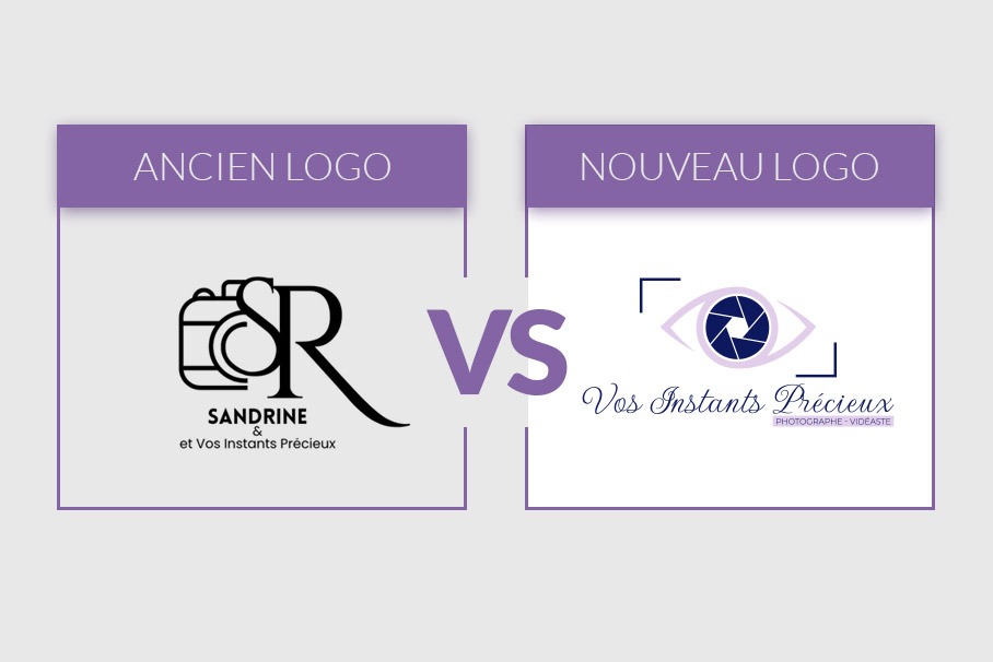Avant/après du logo de Sandrine & Vos Instants Précieux. Refonte d'identité visuelle pour photographe et vidéaste dans la Loire.